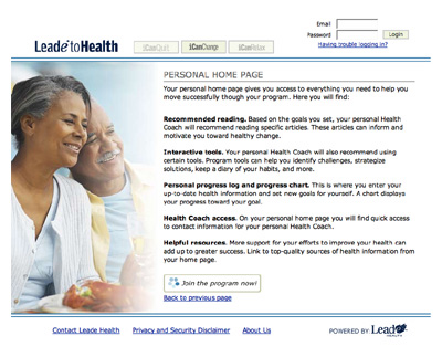 Three integrated lifestyle management websites ( Smoking Cessation Weight Management and Stress Managemnent ) for Leade Health Inc.. System includes article navigation and log in as well as several sub applications including a menu planner, fitness log, quizzes, etc.. The three sites are fully integrated and included working with a custom built content management system. Worked with existing site architecture and adapted menu system for a more pleasing user experience. The main challenge here was a creating working with complex content in a way that would integrate with various client's existing site architecture and graphic design.